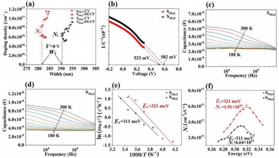 采用Mo基底在空气中退火得到MoO2调控层。然后采用磁控溅射及后硒化方法制备得到Sb2Se3光吸收层,从图3的结果可知,MoO2界面调控层可有效提高器件光电转换效率5.5%至8.14 %, 降低背接触势垒。另外,我们采用XPS和UPS分别获得有MoO2层的电池器件与无MoO2层电池器件的背界面接触势垒,发现MoO2界面调控层可降低背接触势垒,这说明MoO2层可降低光生载流子在背界面处的复合。从图4的结果,具有MoO2层的Sb2Se3器件的剖面TEM图可以观察到Sb2Se3/CdS界面晶格匹配情况,结果证明MoO2层也相应改善Sb2Se3/CdS异质结界面晶格匹配度。在图5的器件物理参数表征的结果中,MoO2层可减少Sb2Se3/CdS界面的缺陷浓度,增强内建电势,减少Sb2Se3薄膜的体缺陷浓度。