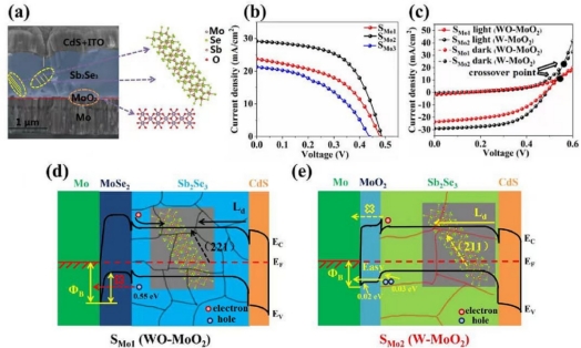 图3有MoO2界面调控层与无MoO2界面调控层Sb2Se3器件的J-V、背接触势垒及器件背界面能带分布