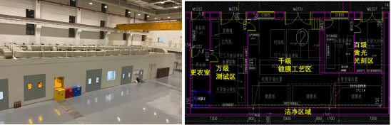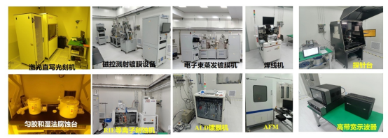 为了实现CMB的探测,迫切需要研发出TES的生产工艺。依托于南方先进光源预研平台的微纳加工设备(图7),我们开发了用于TES的光刻、镀膜、刻蚀、封装等较完整的半导体微纳加工工艺。目前已具备TES的加工功能,已生产出TES样机, 并初步测得性能(图8)。