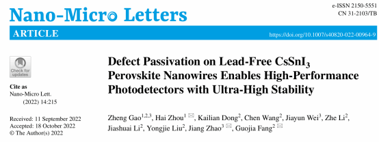 近日,公司周海特聘教授团队在无铅钙钛矿纳米线器件领域取得新进展,以“Defect Passivation on LeadFree CsSnI3 Perovskite Nanowires Enables HighPerformance Photodetectors with UltraHigh Stability”为题,发表于SCI期刊Nano-Micro Letters,伟德国际victor1946为第一通信单位。《Nano-Micro Letters》属于中科院一区TOP期刊,影响因子23.655。