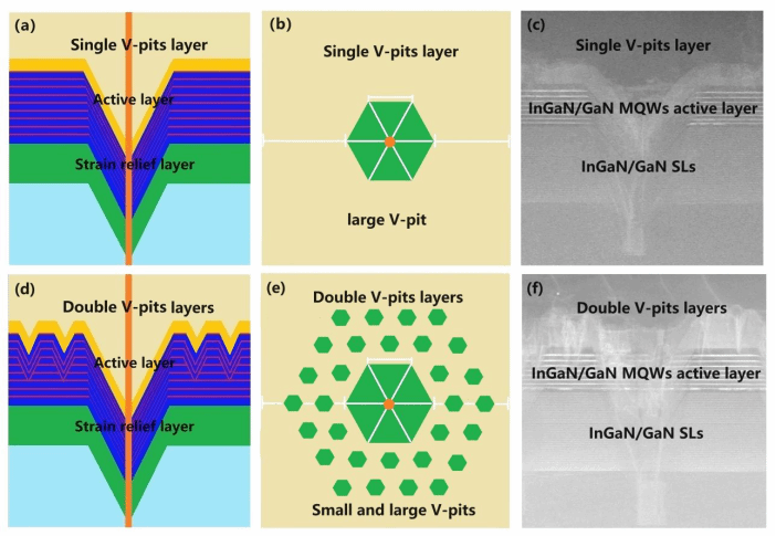 基于AlInGaN材料体系的微小型发光二极管在显示领域应用潜力巨大。然而,InGaN基红色LED的内量子效率(IQE)较低,限制了其发展和应用。在文章中设计的红光LED外延结构中,采用双V坑层作为应变消除层,以减小压缩应变,提高有源层的IQE。首先,在活性层下方生长InGaN/GaN超晶格(SLs),形成低密度大V型坑层。随后,采用多周期绿色和红色复合量子阱作为有源层。通过调整绿色多量子阱(MQWs)的生长参数,在有源区引入高密度小V坑层来释放压缩应变。V型凹坑将连续的大面积活动层分割成相互隔离的小块,阻止应变的传递,将长程应变转化为分离的局部应变。在613 nm和612.1 nm处,单V坑层LED A2和双V坑层LED B4的IQE峰值分别为10.5%和21.5%。IQE提高了204.7%。研究结果表明,双V型凹坑结构可以减轻InGaN量子阱的压缩应变更有效,减小了压电极化FELD的影响,提高了IQE。