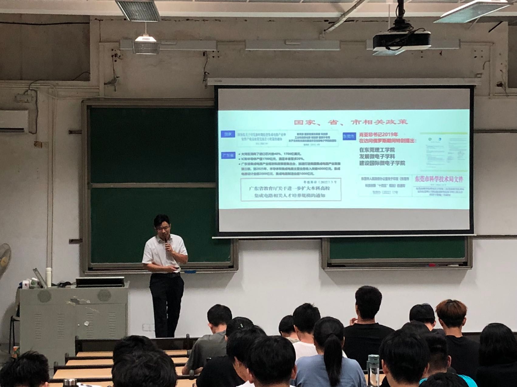 任斌围绕广东省第十三次党代会上提出的“聚力推进高水平科技自立自强,打造具有全球影响力的科技和产业创新高地”这一发展目标,为同学们上了一门紧扣时事、生动别样的思政课。任斌首先从当前大背景出发,让同学们了解到我国半导体设备低端制程实现国产替代,高端制程有待突破,设备自给率低、需求缺口较大的现状,由此引申出掌握关键设备技术,发展集成电路产业的重要意义。随后任斌向同学们介绍了集成电路的特点、芯片的制造流程、集成电路的企业发展、东莞集成电路产业发展现状等内容,并列举出多个典型事例,如光刻机技术受限、高校测试用的软件被禁用,让同学们更加深刻的了解到我国集成电路产业发展的不易,激发同学们自强奋斗的爱国情怀。