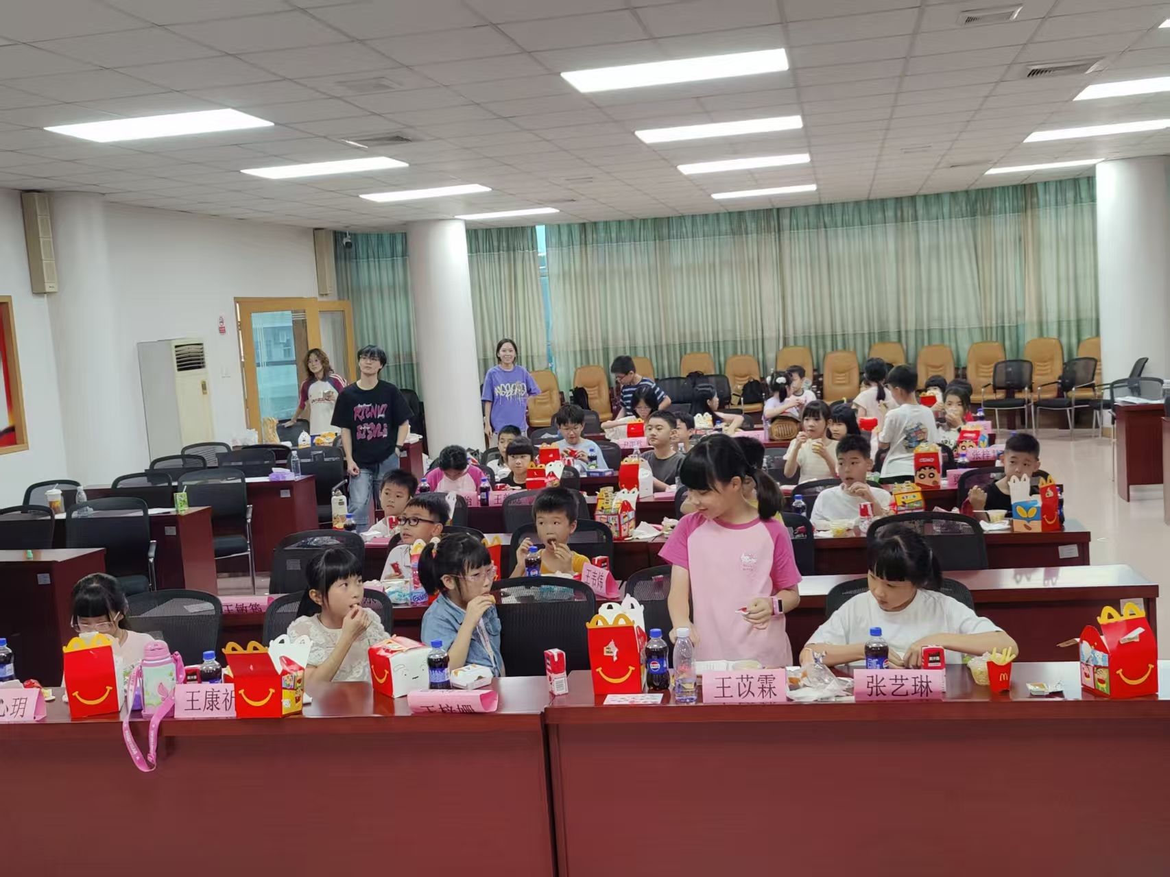 结营仪式筹备阶段,副队长吴巧敏组织开展了积分兑换拍卖活动,并为全勤学员颁发专属奖品;队长李锦欣播放精心剪辑的视频,回顾实践队与孩子们相处的精彩片段,其他成员负责发放结营纪念品,现场氛围温馨热烈。