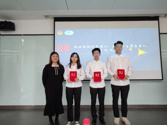 卢楚韵老师为临时团组织负责人郭子腾和临时员工会负责人刘世达、林展鹏颁发聘书。