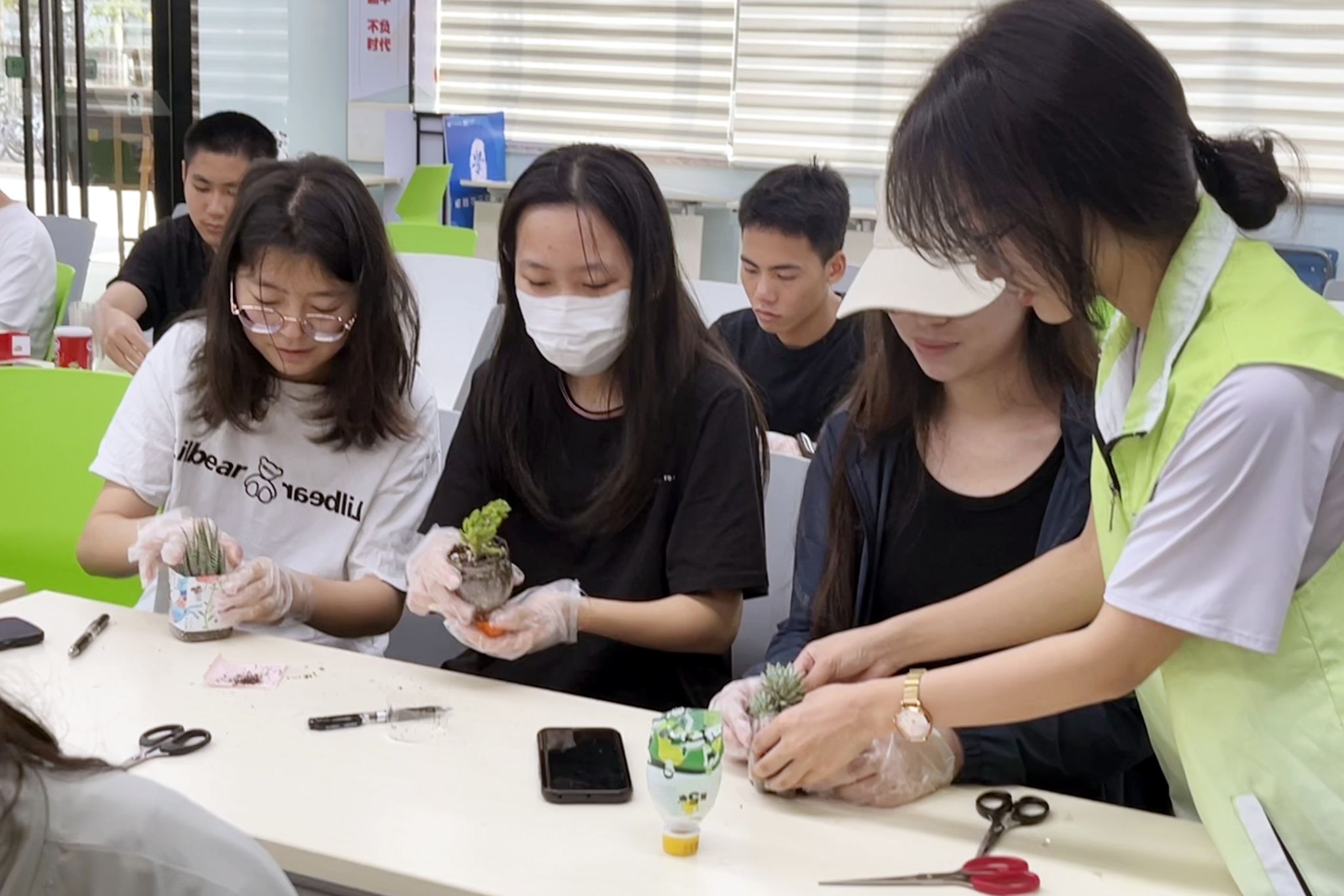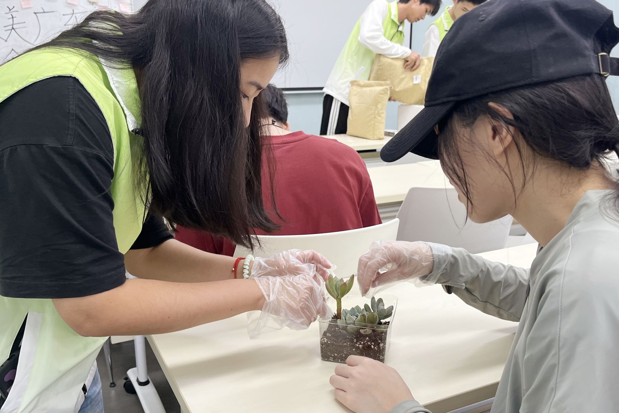志愿者们拿出提前收集好的废弃物品,通过构思设计,将各种废弃物品修建成多肉植物的“豪华大别墅”,为自己充“植”成功的同学们脸上洋溢着喜悦,充满了成就感。活动期间,许多爱好绿植的同学纷纷来到活动现场,充分调动了同学们参与志愿活动的积极性。