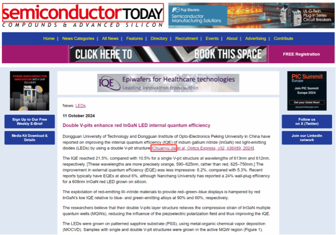 近日,伟德国际1946亚洲版和北京大学东莞光电研究在Optics Express 发表InGaN红光发光二极管的研究成果被国际知名半导体杂志Semiconductor Today专题报道。文章中报道了采用双V坑结构提高InGaN红色发光二极管(LED)的内部量子效率(IQE)的最新研...